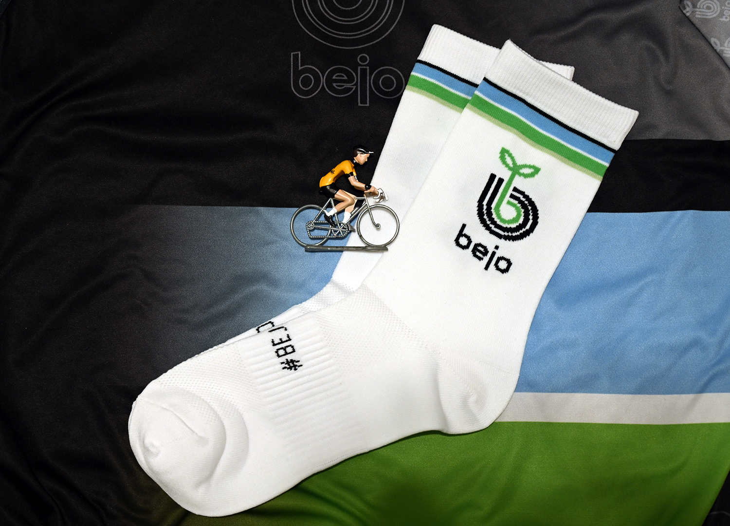 Maak je fietstenue compleet met deze geborduurde BejoFit-sokken! Deze zijn beschikbaar in kleine oplage in twee maten, die (bij benadering) geschikt zijn voor mensen met maat 35-39 en voor iedereen met maat tussen 39 en 45.