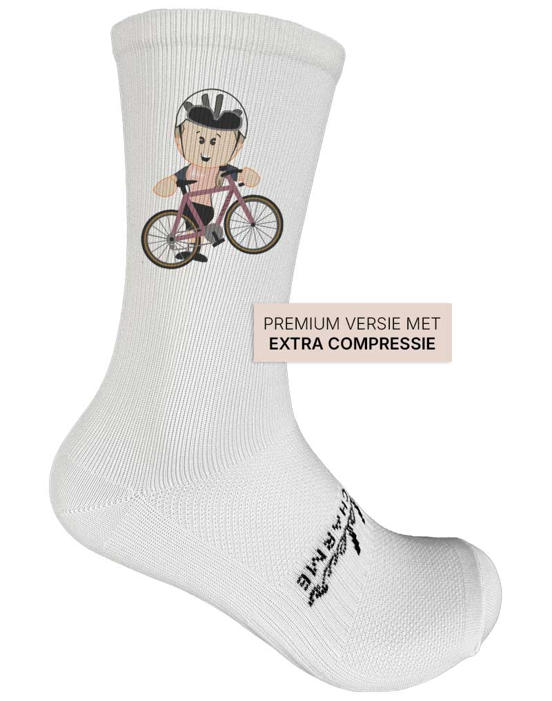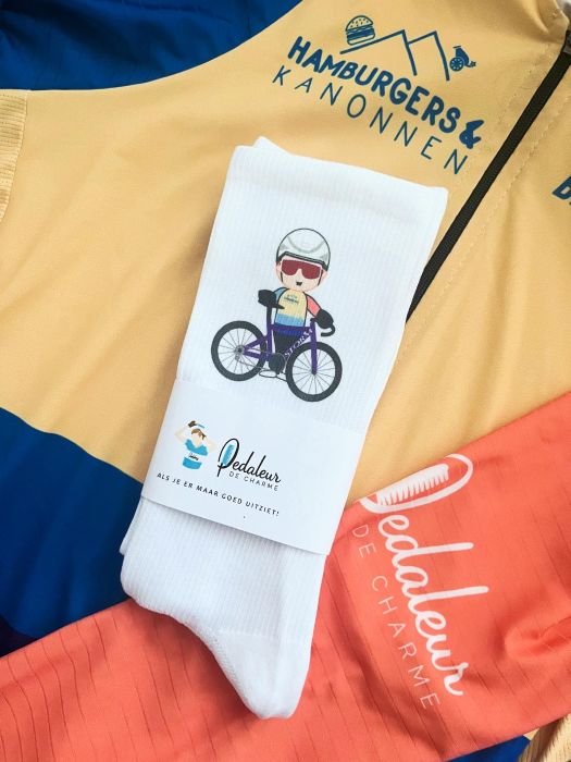 Zowel een paar uit de collectie als een gepersonaliseerd paar gekocht. Ontzettend leuk om cadeau te geven of krijgen, de persoonlijke touch maakt het van een normale sok tot iets bijzonders waar je op elke fiets in elke versnelling mee aan kan komen. Uitstekende en snelle service, s avonds het ontwerp, de vokgende dag op de post ,top!!!