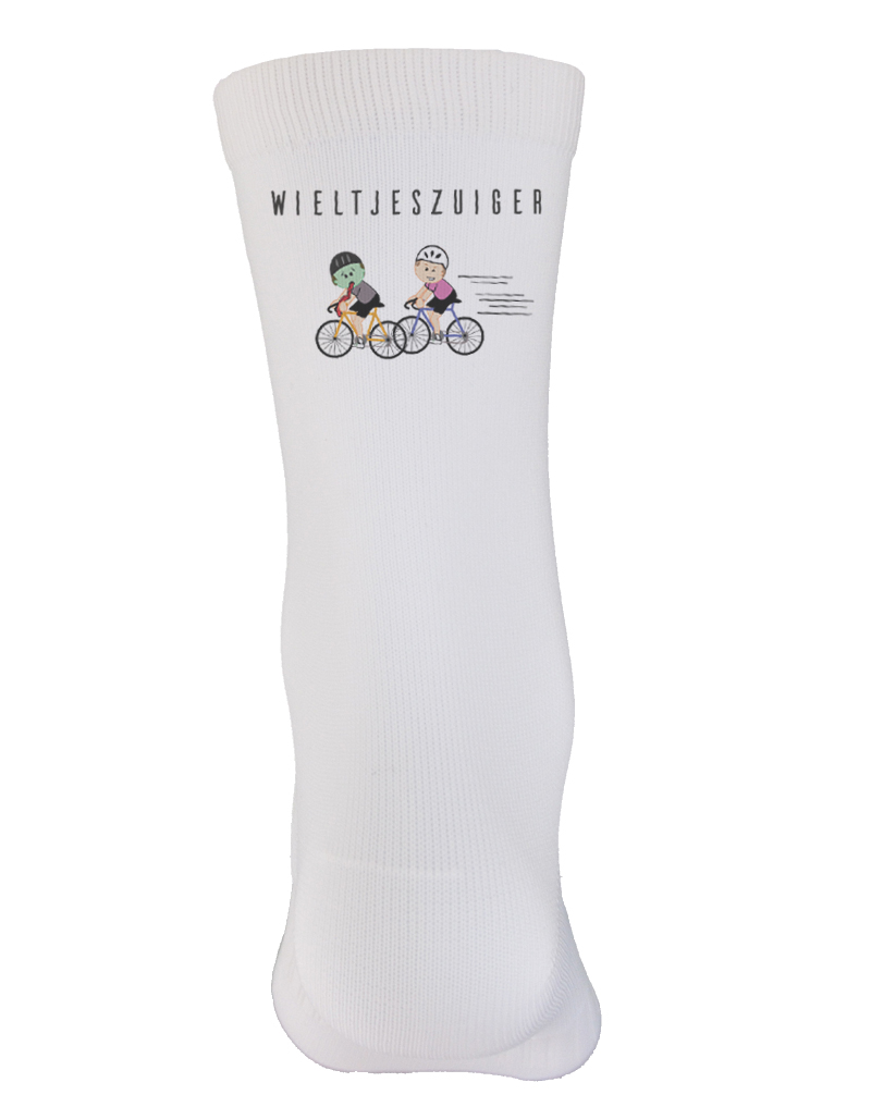 Het is een ergernis voor veel fietsers: ben je jezelf helemaal aan het afbeulen met windkracht 5 tegen, zit er zo’n hinderlijk figuur de hele rit lekker te profiteren in je wiel. Special voor deze mensen hebben we de ‘wieltjeszuiger’ fietssok gemaakt. Zodat diegene die achter je rijdt goed kan lezen wat je van hem vindt.